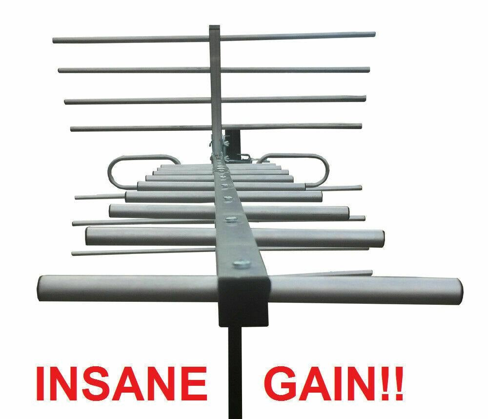 Our heavy duty insane gain model has 500% more UHF "antenna" gain (option 2 also has long range VHF as well, with 12 x VHF elements) than our powerful indoor flat TV antennas and up to 200% more UHF "antenna" gain (not to be confused with signal amplifier gain), than many of the tiny 12 inch outdoor antennas advertising 150 and 250 mile range online! Don't be duped by tiny outdoor tv antennas and flat antennas advertising crazy range, it's impossible due to their geometry and size.